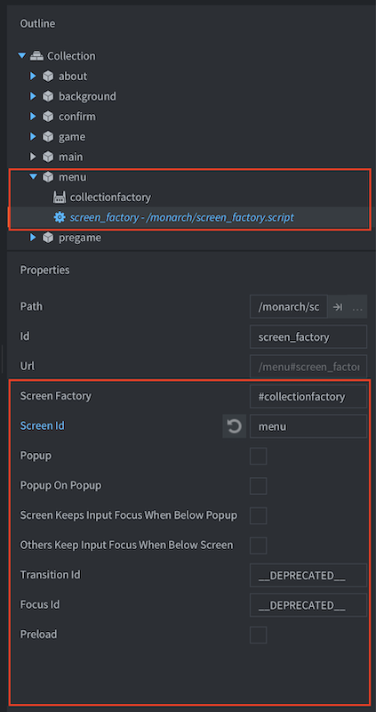 - Focus Id (hash) - DEPRECATED Optional id of the game object to send a message to when the screen gains or loses focus (see the section on screen focus).