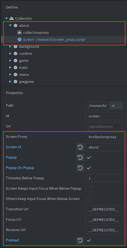 monarch.post(). - Preload (boolean) - Check this if the screen should be preloaded and kept loaded at all times. For a collection proxy it means that it will be async loaded but not enabled at all times while not visible. This can also temporarily be achieved through the